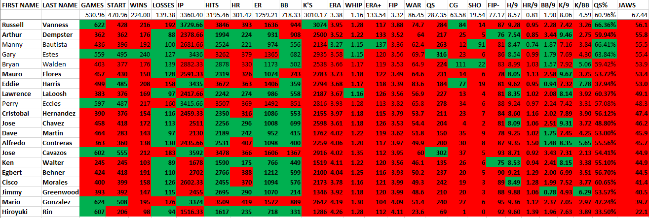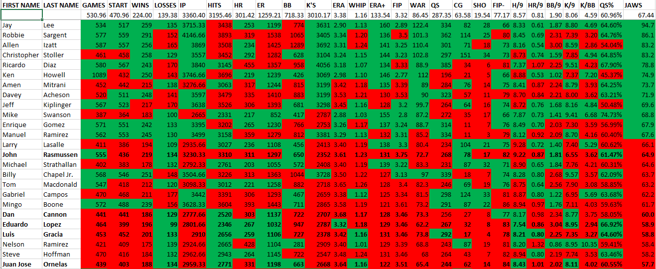 Listed below are all of the SP in the HOF. I also took any retired guys with WAR over 60 and active guys who were over the 40ish JAWS range (that active list is not a hard and fast limit). The list is sorted by JAWS, and the bolded individuals with no position listed are NOT in the HOF presently. Some are on the ballot, some have already passed their time. Green is better than the positional average for that category, red is worse and white is either a tie or 0 (funky excel formatting). Feel free to offer your thoughts below.