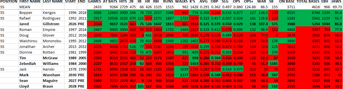Listed below are all of the SS in the HOF. I also took any retired guys with WAR over 60 and active guys who were over the 30ish JAWS range (that active list is not a hard and fast limit) as well as anyone presently on the HOF ballot. The list is sorted by JAWS, and the bolded individuals with no position listed are NOT in the HOF presently. Some are on the ballot, some have already passed their time. Green is better than the positional average for that category, red is worse and white is either a tie or 0 (funky excel formatting). Feel free to offer your thoughts below.