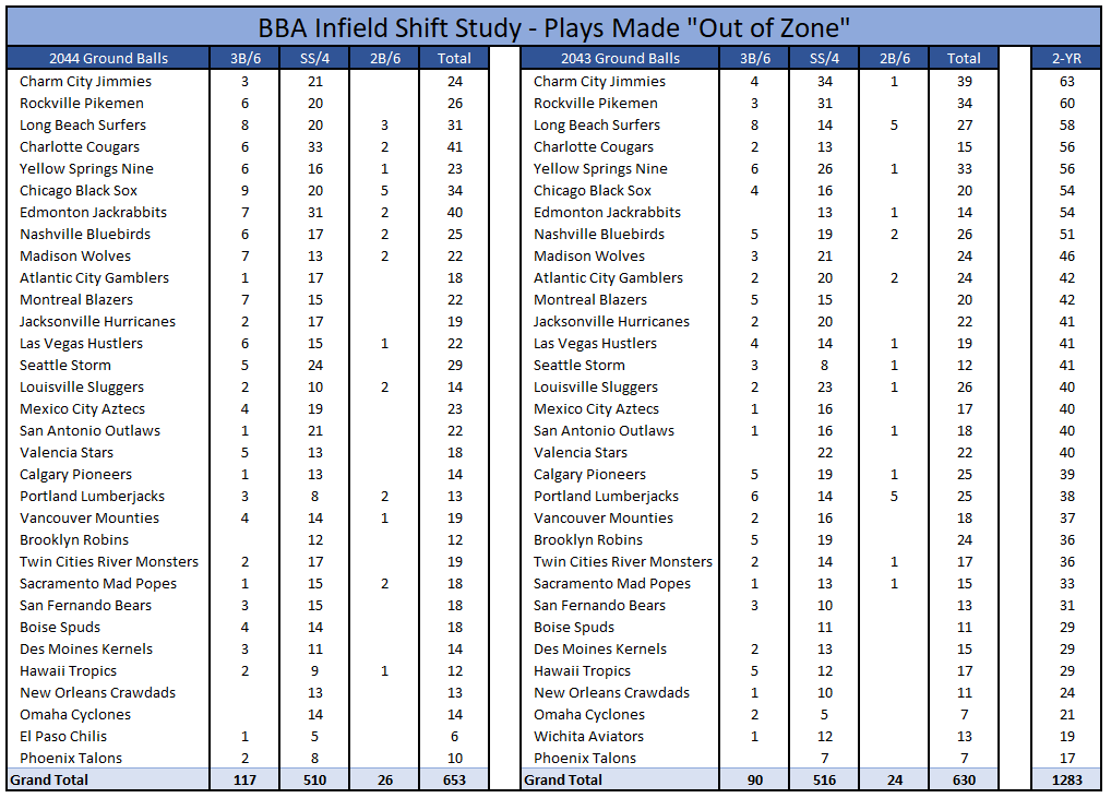 Yeah, I'm sure a lot of this is dependent on the range of the middle infielders. That would be one helluva study to figure out.chicoruiz wrote: ↑Fri Nov 20, 2020 4:49 pmI don’t know how the zones are delineated, but I wouldn’t be surprised if many of the 14 plays that my shortstop made to the right of 2B were not a result of full shift per se, but rather the end product of the shortstop just shading a left-handed batter that way and then crossing the bag by a few feet to make a play. I say that because my second baseman is a converted 3B and no great shakes defensively, while my shortstop is a highly rated “glove only” guy.
