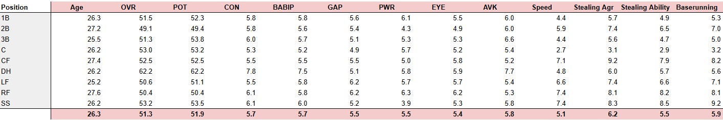 - BBA teams have no trouble getting production from their DHs who are surprisingly young; meanwhile, 2B, CF, and RF are weirdly older than the other positions