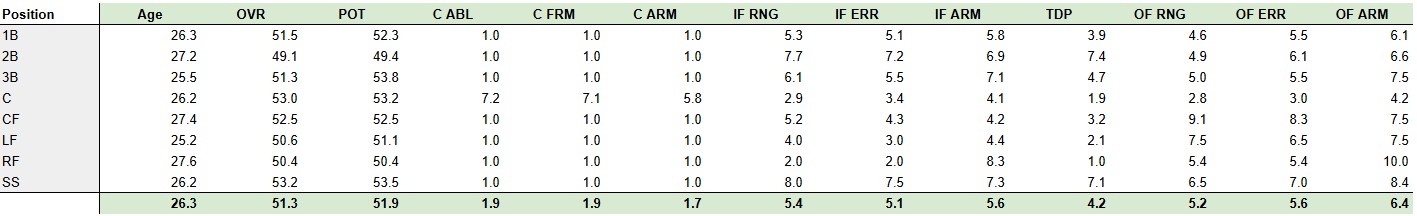 All active players who appeared in a BBA game. Pitching is weighted by IP, offense is weighted by PAs, and defense is weighted by IP in the field. The only blind spot here is retired players being removed from sortable stats.