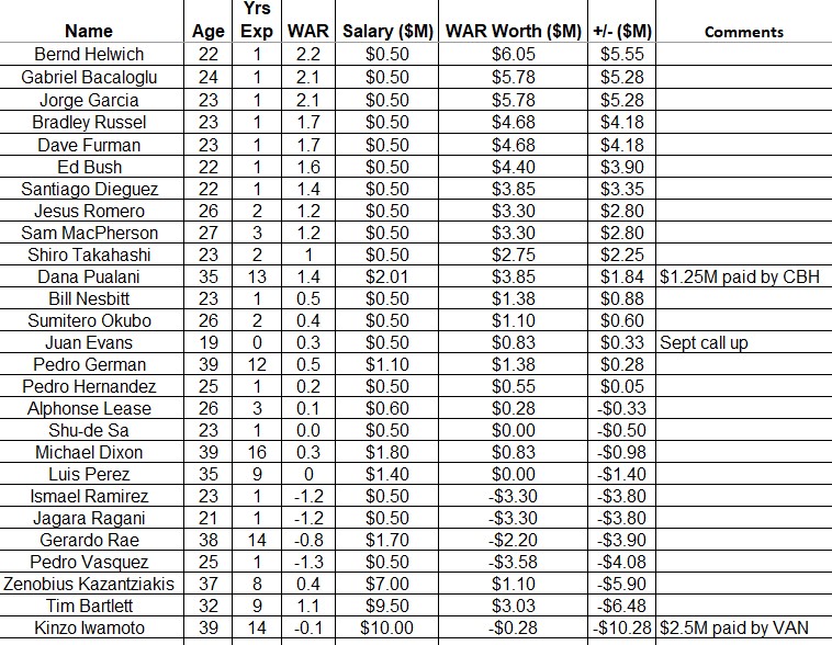 The top three in return of performance versus salary are C Bernd Helwich ($5.55M), 1B Gabriel Bacaloglu ($5.28M) and 3B Jorge Garcia ($5.28M).