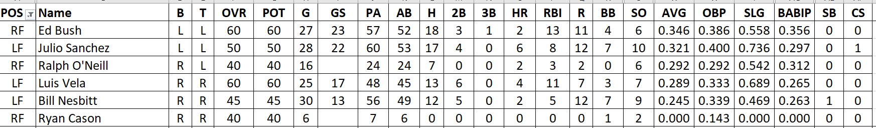 Last year's incumbent in left field was Bill Nesbitt and in right field was Ed Bush. Nesbitt had a decent season in 2063 with 18 homers and a .254 average but the scouts seem to think he has lost a little bit over the off-season although they won't say where. Maybe Bill was caught fraternizing with one of the scout's daughters or something. Anyways, Bill hit for a .245 average and a .339 on-base percentage while adding a couple of homers. In the other corner, Bush had a much better off-season with the scouts claiming that he has better contact, power and plate discipline. The spring stats seem to reflect that assessment as the 23 year old lefty hit for a .346 average with a pair of homers. Coupled with his solid 2063 performance of 24 homers and a .272 average, it is safe to say that one of the spots in the lineup is his.
